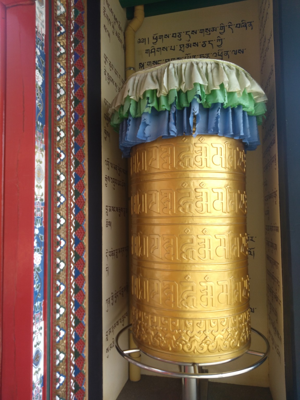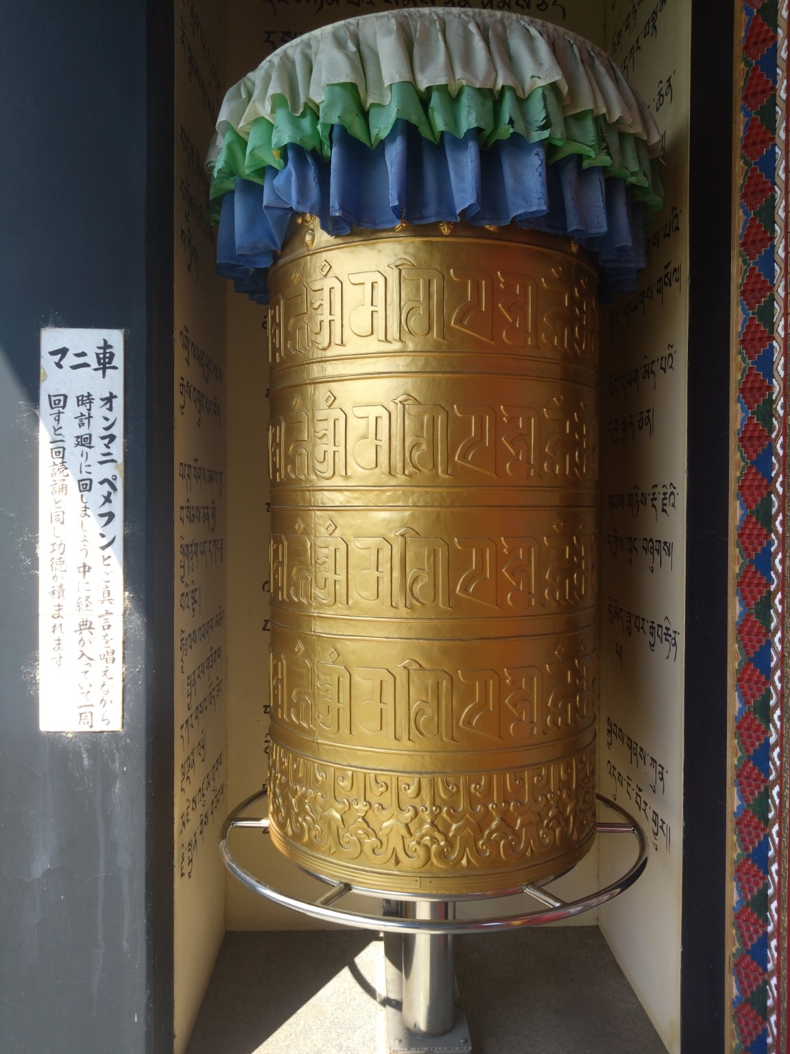 日本のお寺にもありますが、チベット仏教で使われる回転する筒状の仏具で、内部に経文が納められ、側面には真言(マントラ)が刻まれており、これを右回りに回転させることで、回した回数だけ読経したのと同じ功徳(功績)が得られるとされています。